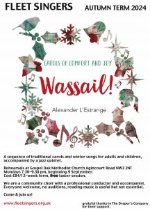 The dates of our Autumn Term (11/9 – 11/12) are almost identical to last year’s but we are reverting to delaying Christmas! and preparing for a concert around Remembrance Day. Our Musical Director has suggested a wonderful selection of music including